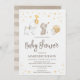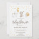 Ajude a celebrar a futura mãe com este convite de chá de fraldas elegante e caprichoso. Apresenta ilustrações em aquarela de lindos animais de floresta desfilando, com instrumentos musicais e adornados com estrelas. Esse convite para chás de fraldas neutro em relação ao gênero é fácil de personalizar, simplesmente adicione nomes, data, hora, local e outras informações sobre eventos. Um chá de fraldas elegante e divertido convida a design.
