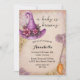 Este chá de fraldas bonito apresenta um tema feminino rosa do Dia das Bruxas que é perfeito para uma menina. O fundo é um design de papel pergaminho rosa esmaecido com borda mágica brilhante. Uma bruxa púrpura bonito que é colocada no topo à esquerda e acentuada com flores e um pouco de teia. Uma vassoura é fotografada à direita. A frase "um bebê está se preparando" é impressa no topo em uma letra elegante.