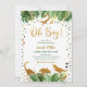 Este adorável convite para chás de fraldas apresenta folhas de aquarela tropicais com embelezamentos de folhas de folha de ouro e silhuetas de dinossauro dourados.