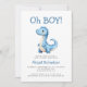 Este chá de fraldas bonito apresenta um dinossauro azul de aquarela abaixo das palavras "Oh BOY!" em letra azul de impressão. Personalize o texto com o nome da futura mãe em azul e os detalhes na fonte serif das cinzas de carvão.