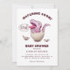 Um cartão modelo de convite para chás de fraldas de convite para dinossauros, bonito, com um bebê rosado, para rex eclodir de um ovo e dizer "rugido". O texto acima diz "Chapéu em breve!" Excelente para o chá de fraldas de uma garota.
