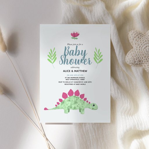 Este design de convite para chás de fraldas de garotos giros e giros apresenta cartoons de dinossauro da selva azul pastel, com t-rex, estegossauro, arco-íris e plantas da selva jurássica, com um padrão de dinossauro no verso, e pode ser personalizado com os nomes dos pais e outros detalhes necessários para o seu partido. O adorável e perfeito dinossauro temia adição ao seu chá de fraldas de casais.