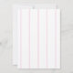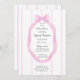 Celebre a chegada da menina com este convite de chá de fraldas rosa e branco. Um arco e fita cor-de-rosa envolve os detalhes do convite, enquanto o plano de fundo consiste em listras cor-de-rosa. A parte traseira da placa apresenta o mesmo padrão distribuído.