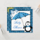 Pinguim super giro com gravata azul de arco bolinhas e com um guarda-chuva de bolinhas e estrelas com chuva brilhante descendo, mas quando o sol brilhante amarelo brilha, o guarda-chuva desaparece. Pobre! Perfeito para um chá de fraldas.
