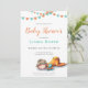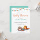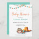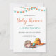 Chá de fraldas bonito em cores neutras. A ilustração tem um bebê dormindo e algumas glândulas laranja e turquesa. Personalize o texto com o seu. Ilustrada e projetada por Patricia Alvarez.