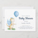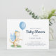 Chá de fraldas branco bonito com uma ilustração de dragão fantástico. O pequeno dragão está segurando um balão azul. Ilustrada e projetada por Patricia Alvarez.