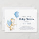 Chá de fraldas branco e azul bonito com um dragão de conto de fadas segurando um balão azul. Excelente para comemorações de fantasia de chá de fraldas de menino ou neutro por gênero. Ilustrada e projetada por Patricia Alvarez.