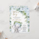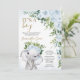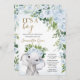 Celebre seu pequeno príncipe com este doce e charmoso Convite para Chá de fraldas de Elefante Boy. Apresentando um adorável elefante bebê vestindo uma coroa de flor azul suave complementada por elegantes florais azuis e verde no lado direito, perfeito para um chá de fraldas de temática menino. Perfeito para um chá de fraldas floral, selva ou com temática elefante, este convite adiciona um toque de doçura e sofisticação à sua celebração. BBS503