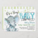Um convite para o chá de fraldas de elefantes. As cores incluem azul, verde e cinzas. Excelente para chás temáticos de animais selvagens ou safari.