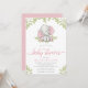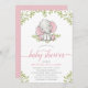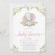 Este doce chá de fraldas verde e elefante cor-de-rosa apresenta ramos de folha verdes modernos e uma ilustração de elefante bebê. Edite facilmente este convite usando as ferramentas de modelo online.
