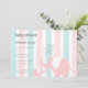 Este convite para chás de fraldas de bebês brancos e bonitos apresenta uma mamãe e um elefante de bebê em rosa sobre um fundo listrado. Facilmente personalizado. ::ENVELOPES INCLUI: