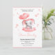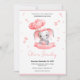 Esta é uma descrição de um elefante bebê fofo com um arco rosa na cabeça e balões cor-de-rosa que são pontilhados com pontos e linhas brancos. A design também inclui estrelas cor-de-rosa nos lados, e tudo é representado em aquarela.