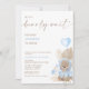 Blue Heart Balloon Balon Wait Chá de fraldas Invitation Boy's bearly wait temed chá de fraldas convite com um urso fofo, balão de coração azul e um arranjo floral branco e azul-bebê com palma e grama-pampas. Podemos esperar que o convite para chás de fraldas também apresente uma rubrica de caligrafia moderna.