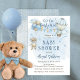 Design de Chá de fraldas bonito com um ursinho de pelúcia com uma gravata de arco azul pendurada num punhado de balões de um lado com um carregando de balão de ar um buquê floral do lado direito. Bandeiras de rebarba penduram entre os dois balões que apoiam as palavras "Nós podemos esperar muito!" Nuvens e estrelas num fundo de aquarela azul ao redor do design. A parte traseira apresenta um céu com cor d'água com bolinhas brancas e bege. Design composto por Designs Holiday Hearts.