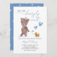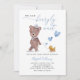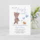 Cartão de convite para chá de fraldas de menino bonito com ilustração aquosa de um ursinho de pelúcia em um equipamento de marinheiro totando um brinquedo de pato com coração azul. O texto diz "Podemos esperar muito."