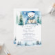 Inverno ártico do urso polar podemos esperar chá de fraldas, com modelo editável Convite para descarregamento digital instantâneo, ursinho polar agudo a aquarelas, vestindo um cachecol azul sentado em pinheiros de neve, pinheiros de neve, convite para chá de fraldas no inverno para um menino.