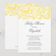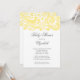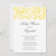 Comece seu chá de fraldas de menina, chá de fraldas neutro de gênero ou chá de fraldas de bebê com o nosso Chá de fraldas de espiral brilhante e elegante amarelo pálido e branco de balas florais definidas em um fundo branco nítido. Personalize nosso convite elegante com suas informações de chá de fraldas e você está pronto para ir. Disponível em outras combinações de cor de bebê na moda no nosso compro em www.celebrateitinvites.com. Veja nossas notas de agradecimento, adesivos e botões de noiva em nosso compro