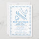 Celebre o seu pequeno a caminho com um convite de chá de fraldas "Esquiar você logo pequeno" inspirado na montanha. Este design de inverno apresenta ilustrações desenhadas à mão em azul macio, incluindo esquis, polos, uma colmeia e uma doce garrafa de bebê — moldadas por uma pequena borda de rabisco rochada num fundo branco nítido. O verso apresenta um fundo azul claro, aspergido com neve caindo. Perfeito para o chá de fraldas de um garoto com uma vibração no inverno. Uma escolha única e encantadora para os pais a serem que amam as encostas, esquiar, conforto, e celebrar no estilo do inverno.