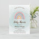 Um convite para chá de fraldas arco-íris de cor aquática. Estes convites para o chá de bebê dino são facilmente personalizados para o seu evento simplesmente adicionando os seus detalhes.