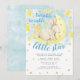 Dourado Coelho Azul Brilhante Brilhante Pequeno Convite Para Chá de fraldas Estrela. Para um bebê e adequado para o tema "Pequeno Estrelinho" do Twinkle Twinkle Twinkle. Apresenta coelho aquoso em meia lua e brilho de ouro falso.