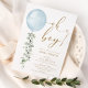 Este chá de fraldas elegante apresenta eucalipto verde macio, balão azul de aquarela e tipografia moderna.