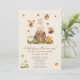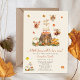 Tema do chá de fraldas de fadas com ilustração do toco de madeira rodeado de folhas e abóboras e decorado com uma porta. Stump é tocado com bolo tocado com sinal de "É uma garota".
