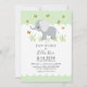 O encantador convite ao chá de fraldas moderno mostra elefante e borboletas para bebês cinzas. O padrão de listras brancas no verso adiciona um toque extra.