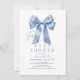 Este convite para chá de fraldas de coquetes e garotas bonitas apresenta um arco/fita azul grande. O verso apresenta um fundo branco com xadrezes/verificações de gingham azuis. Personalize-o para as suas necessidades. Você pode encontrar produtos correspondentes na minha loja.