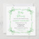 Este convite de chá de fraldas giro e caprichoso apresenta um bonito quadro verde de fita. O texto combina o script manuscrito e as fontes sans serif para uma aparência na moda e moderna.