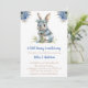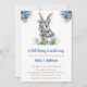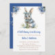 Um coelho doce e fofo segurando um buquê grande e azul de flores. Convite perfeito para Chás de fraldas durante a Páscoa, ou em qualquer momento do ano.