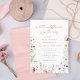 Convite para chás de fraldas moderno e chic com lindas flores de aquarela pintadas manualmente organizadas ao longo da borda, um roteiro elegante de caligrafia mostrando "Um pouco de flor selvagem está a caminho" que é perfeito para chás de fraldas de primavera ou de verão.