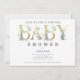 Chá de fraldas virtual de longa distância por correio. Convite elegante e chico, simples e moderno ao chá de fraldas, com letras do alfabeto ouro com folhagem de flores botânicas. O fundo apresenta lindas aquarelas florais em cores púrpura e azul.