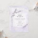 Convite de chá de fraldas elegante com flores de Lavanda aquosa em fundo púrpura de lavagem a cores aquáticas. Os detalhes do chá de fraldas são sobrepostos em um quadrado branco transparente.