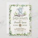 Convite para chás de fraldas com ilustração de verduras e folhagens de aquarelas rústicas e de um adorável elefante para bebês