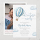 Este charmoso convite para chás de fraldas apresenta um balão e nuvens de ar quente azul e bonito, juntamente com a elegante tipografia de script. Com o código QR do registro e a foto especial no verso. Projetado por Thisnotme©