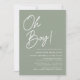 Simples convites para chuveiros de bebês com "Oh Boy!" exibido em um roteiro branco ousado com um fundo verde sábio. Personalize os convites minimalistas para chuveiros de bebês com o nome e os detalhes do chá da mãe. O chuveiro verde de bebê sábio convida ao contrário para exibir sua foto de gravidez e texto personalizado. Os convites são perfeitos para chás de fraldas de menino!