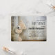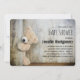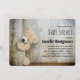 Um convite para o chá de fraldas com uma fotografia de querido de um urso de pelúcia fofo, em pé de uma parede russa de madeira / pano de fundo.