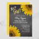 Convites de chá russo e de bebê do jardim de girassóis... Faux, o quadro de chalkboard vintage parece fundo. Um girassol solteiro, belo, amarelo-jumbo decora os cantos superior e inferior diagonalmente. Personalizado com o nome da futura mãe. Lê 'É uma garota!' em branco e amarelo ensolarado. O dorso tem um plano de fundo amarelo sólido, que pode ser mudado para qualquer sombra que você quiser. Use o botão Personalizar para alterar qualquer coisa - estilos de fonte, tamanhos, cores ou posicionamento. A festa de chá de fraldas das meninas florais do país convida para temas de jardim de primavera, estilos de campo rústicos, estilos de quadro, temas florais de boho, chás de verão ou outono e cores de chá de fraldas amarelas. Convites de bebê para professores. Temos material de coordenação, papel de chá de fraldas de girassol e decoração em nosso compro Zazzle.com/angela65*.