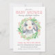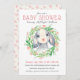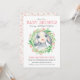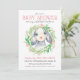 Um belo convite para o chá de fraldas celebrar a chegada de uma menina, esta design tem um adorável carneiro rodeado por uma coroa de flores aquáticas e verde. O reverso do convite tem um doce padrão de corações cor-de-rosa dispersos. Edite o modelo de texto com os detalhes do seu chá de fraldas.