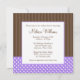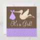 Um convite para chá de fraldas de menina roxo e marrom. Apresentando um carregando de cegonha um pacote roxo. Tendência e moderno — Personalize facilmente seu chá de fraldas!