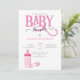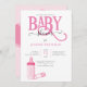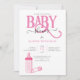 Adorável convite de CHÁ DE FRALDAS cor-de-rosa com tipografia PINK BABY e garrafa de bebê rosa.