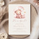 Este convite de chá de fraldas bonito apresenta um doce ursinho de pelúcia a cores-d'água em um vestido cor-de-rosa rosa rodeado por estrelas douradas sobre as palavras "É uma Rapariga!" em um roteiro empoeirado de caligrafia rosa. Personalize o texto com o nome da futura mãe no script e os detalhes na fonte sans serif em um fundo bege.