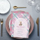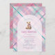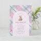 Celebrar a chegada com este adorável convite de chá de fraldas com um doce ursinho vestindo um arco cor-de-rosa, enquadrado dentro de um gracioso design de arco. O fundo destaca uma xadrez de rosa claro acentuada com lavanda e verde-marinho, criando uma paleta fresca e alegre. No verso, uma versão mais escura da xadrez adiciona profundidade e contraste para um acabamento polido. Uma escolha perfeita para um chá de menina, esta design combina o charme clássico com uma cor moderna e divertida.