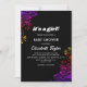 Este elegante convite de chá de fraldas preto e branco é perfeito para um chá de fraldas floral moderno. O simples design apresenta decorações florais néon brilhantes com tipografia branca elegante sobre fundo preto.