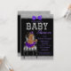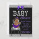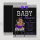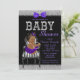 Chá de fraldas roxo, preto e prateado convidando uma adorável menina africana americana vestindo um tutu roxo bonito e uma corda de pérolas sentadas em uma cadeira branca e preta em um roxo preto elegante e fundo brilhante prateado. Este convite para chás de fraldas roxo e ouro moderno é facilmente personalizado para o seu evento simplesmente adicionando os seus detalhes no estilo de fonte e na cor da sua escolha. Você pode alterar a cor de fundo. Este é um design impresso sem brilho real, arcos, etc.