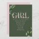 Tema de chá de fraldas com o texto "BABY", cor-de-rosa, rodeado por eucalipto verde, flores, coelhos e ovos de Páscoa. O fundo é verde-escuro na frente. O lado inverso é rosa.