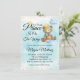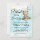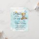 Celebre a chegada de um pequeno príncipe com este belo e elegante convite de chá de fraldas, com um pequeno príncipe urso em azul e ouro. Perfeito para um chá de bebê, este design moderno impressiona seus convidados. Personalize com seus próprios detalhes para um toque personalizado.