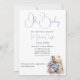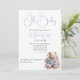 ursinho de pelúcia doce com o convite do chá de fraldas do menino das flores feito em fundo branco com um adorável trabalho de arte de ursinho vestido de azul, em frente às flores, no fundo do convite. Personalize todos os campos de texto para o evento do seu chá de fraldas.