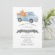 Este belo vintage, e rústico "um pequeno abóbora a caminho", o convite para o chá de fraldas de um menino apresenta um caminhão azul cheio de abóboras e flores. O verso apresenta um fundo branco com padrões de verificação de gingham azul. Personalize para suas necessidades. Você pode encontrar mais produtos correspondentes na minha loja.