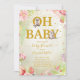 Ilustração de aquarela de adoráveis bebês na frente do "oh baby" em ouro. Adoráveis estrelas de brilho ouro rodeiam estas criaturas animais bonitinhas que dizem "miau!". Celebrar o chá de fraldas em homenagem à futura mãe.